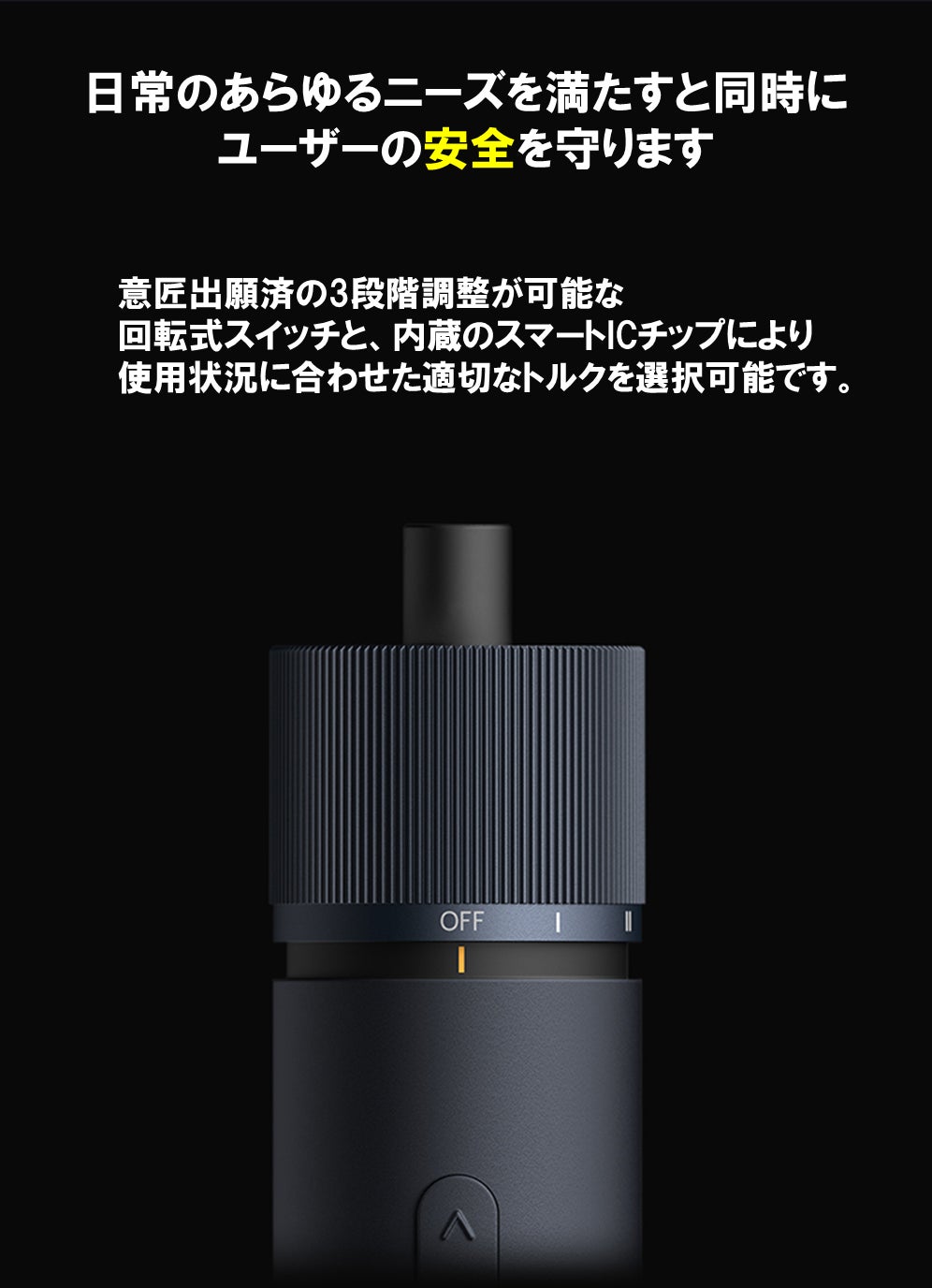 - また、3段階の回転式スイッチと内蔵のICチップにより、様々なニーズに合わせて正確にトルクを調整することができます。
