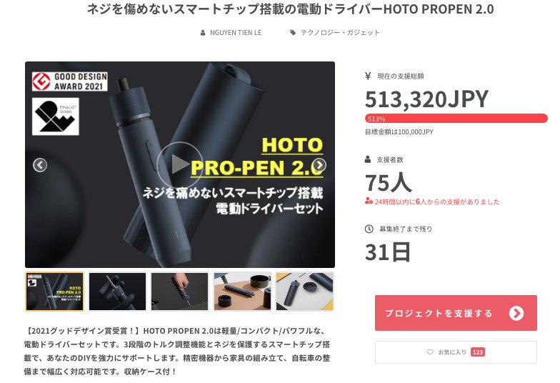 この度は、「ネジを傷めないスマートチップ搭載の電動ドライバーHOTO PROPEN 2.0」にご支援頂き誠に有難うございます。