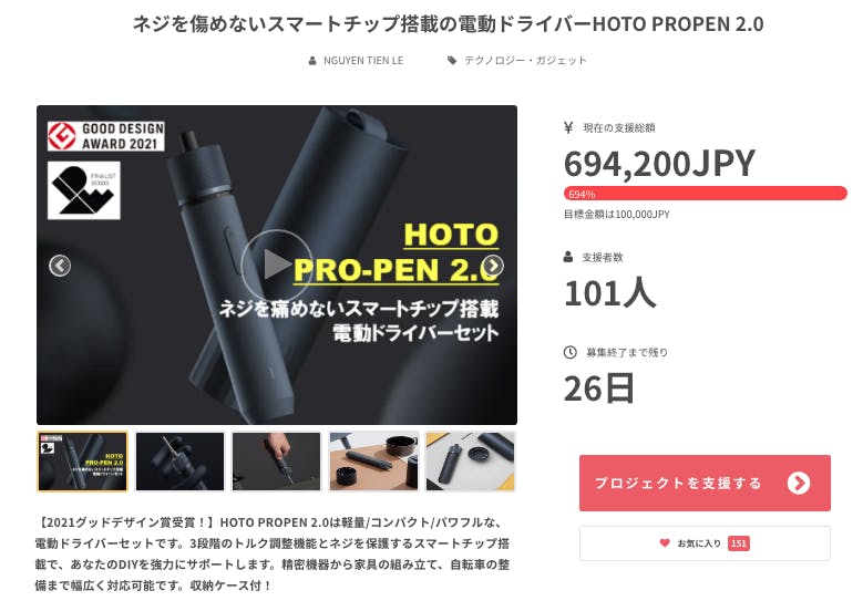 この度は、「ネジを傷めないスマートチップ搭載の電動ドライバーHOTO PROPEN 2.0」にご支援頂き誠に有難うございます。