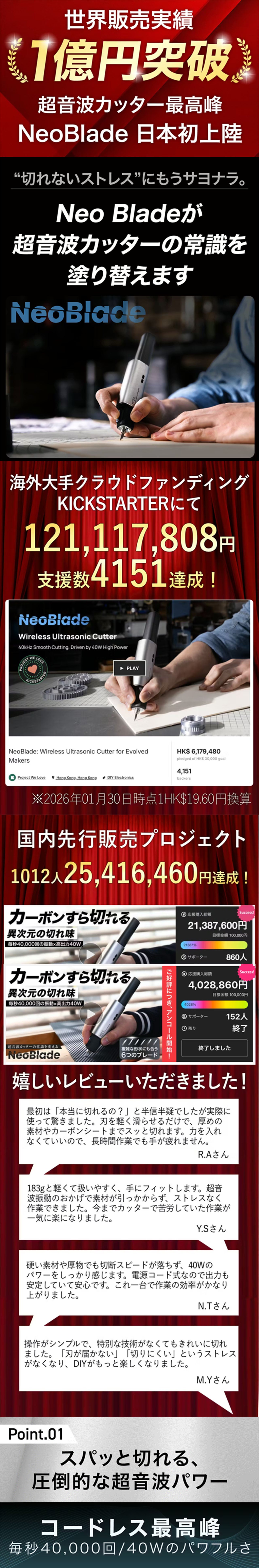 今回は皆さまに「超音波4万回×40Wの圧倒的切断力。6種ブレードで複雑な曲線も硬質素材もスムーズにカットできる次世代コードレスカッター。183gの軽量設計でどこでもプロ級の仕上がりを実現」プロジェクトを紹介させて頂きます。