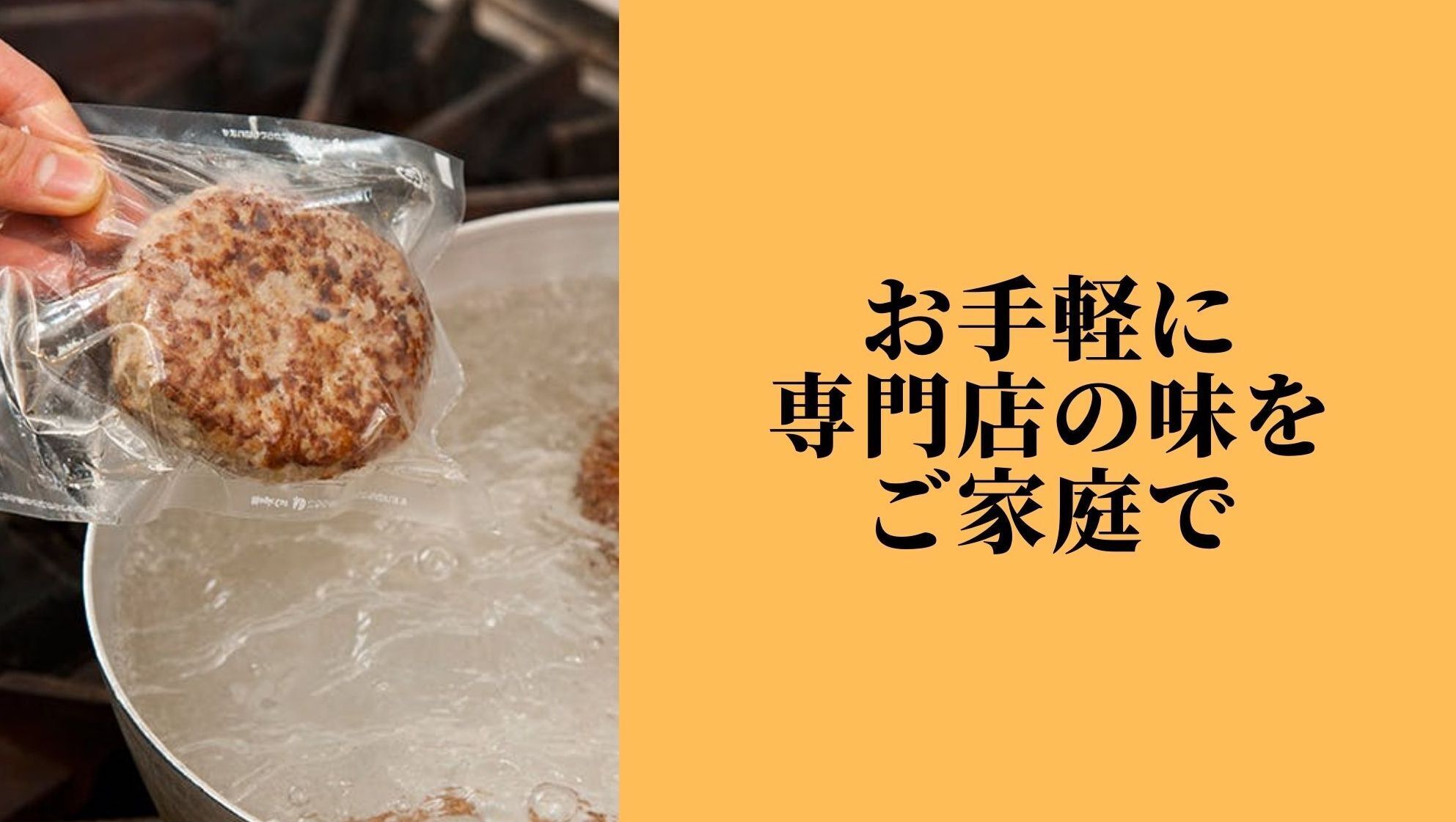 できるだけお手軽に、しかもハンバーグの味を損なうこと無く調理して頂ける方法として”湯せん”に着目し、長期間の度重なる試行錯誤を繰り 返して焼き加減や保存方法などを湯せんに最適な形に追求することで”ただ、たっぷりのお湯で15分ゆでるだけ”でハンバーグ専門店の味をご家庭でお楽しみ頂けるハンバーグを実現致しました。