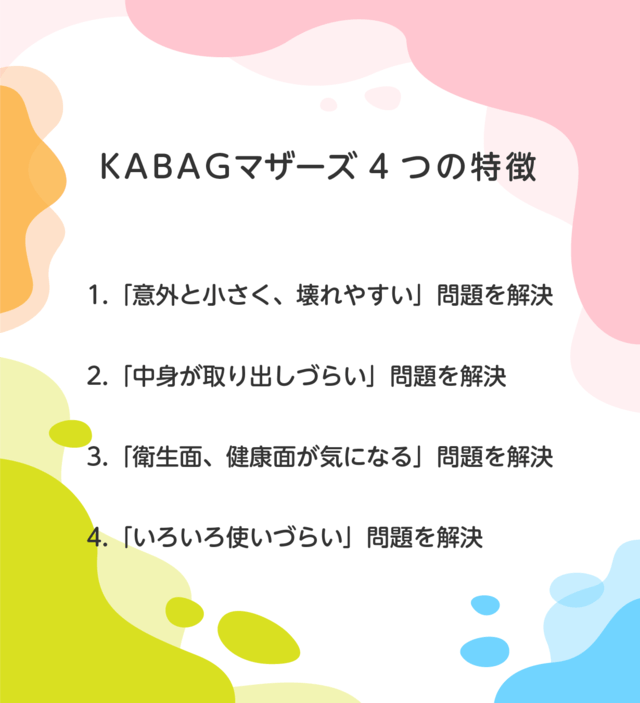 ママさんたちに心地よく使っていただけるようにつくった「KABAGマザーズ」の特徴をご紹介します。