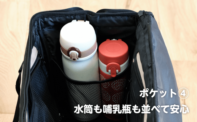 子どもの成長とともに変化する中身を全部入れられる容量にしたのが今回のKABAGマザーズ。上部には2Lペットボトルが6本、下部には2Lペットボトルが2本がすっぽり入る容量です。