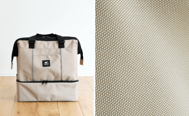 サイドには水筒を2本並べられるメッシュポケットを設けています。ゆとりがあるのでポーチなども入ります。