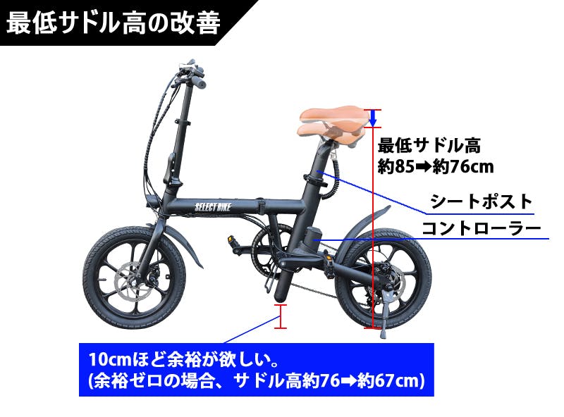 そこで、シートポスト内でのバッテリー配置を見直し、最終的に約10cm短縮できることになりました(折りたたみ時の高さも10cmほど低くなります )。そのため、掲載写真においては、シートポストが長めですが、支援者の皆様に発送する製品においては、シートポストが短くなっております。これにより、サドル高(推定)76cm程度の設定からご使用頂けます。