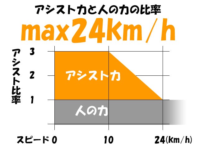 A:時速10kmまでは力強く、それ以降は次第にアシスト力が弱まり、時速24km以上ではアシストがなくなりますので心配ありません。
