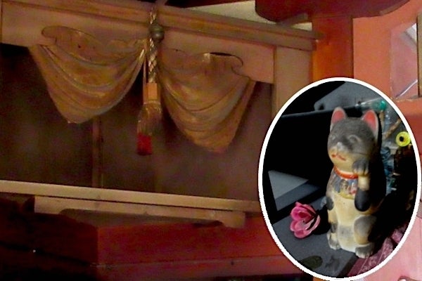 玄関を入って左側の神棚と、室内から発見された招き猫