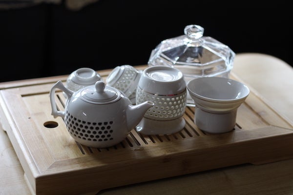 写真のような中国茶特有の「工夫茶器」を使い、中国茶の香り・色・味わいをお愉しみいただけます。