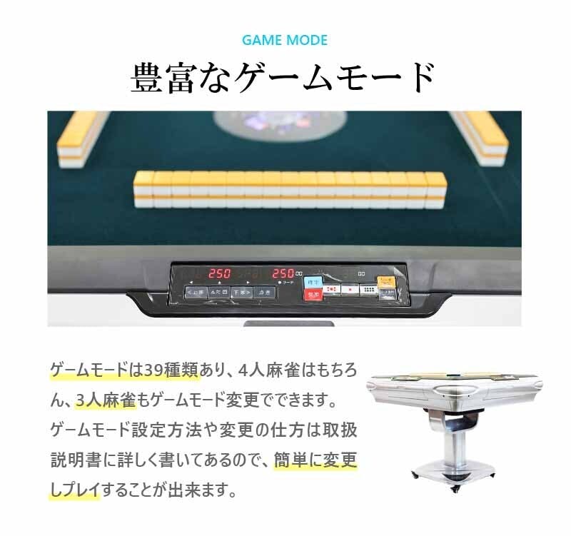 外観だけからその変化を確認することは難しいですが、ようやく、使いやすく高機能な全自動麻雀卓をお手頃価格で提供できるようになったと考えております。 当商品は、そんな全自動麻雀卓の先行販売品となります。