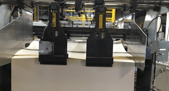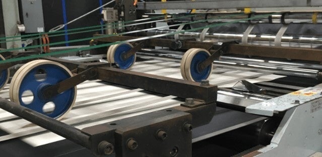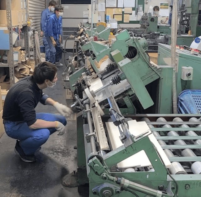複数の厚さのkome-kamiを用意したり、事前にkome-kamiを曲げて「クセ」をつけるなど、様々なパターンで機械を動かしていただけることになりました。大きな音を立てて機械が動き始めると、流れるようにノートの製造が始まりました。