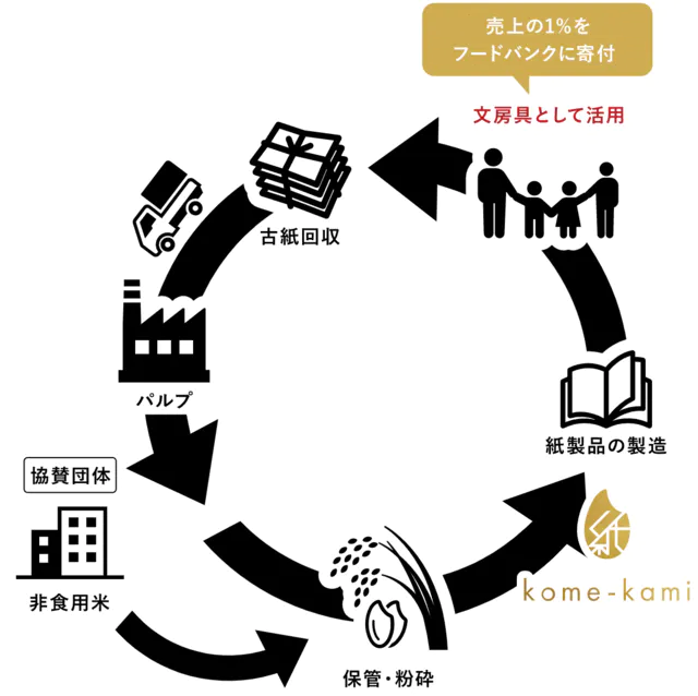 そのためには、皆さまに食品ロスについて知っていただき、食品ロスを防ぐような行動を取っていただくとともに、フードバンク事業を行う団体にkome-kamiの売上の一部を寄付し、お米に限らず全ての食品が最適な場所に流れるように応援します。