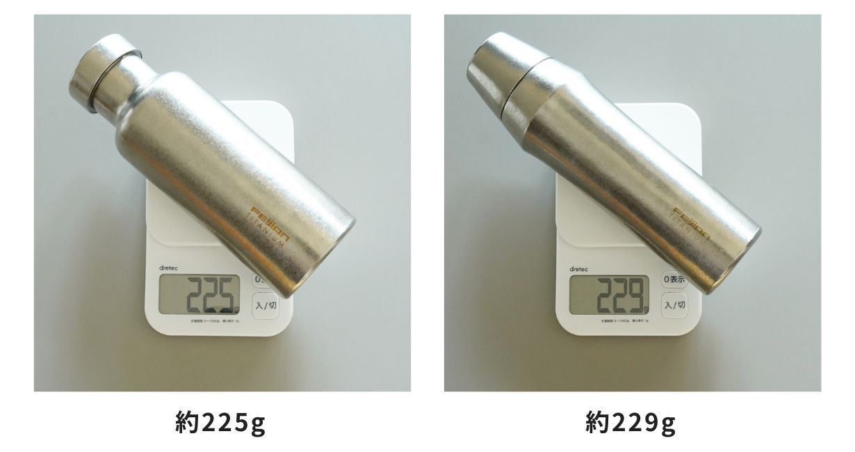 取っ手付きの容量500mlタイプは約225g、コップ付きの容量380mlタイプは約229g。