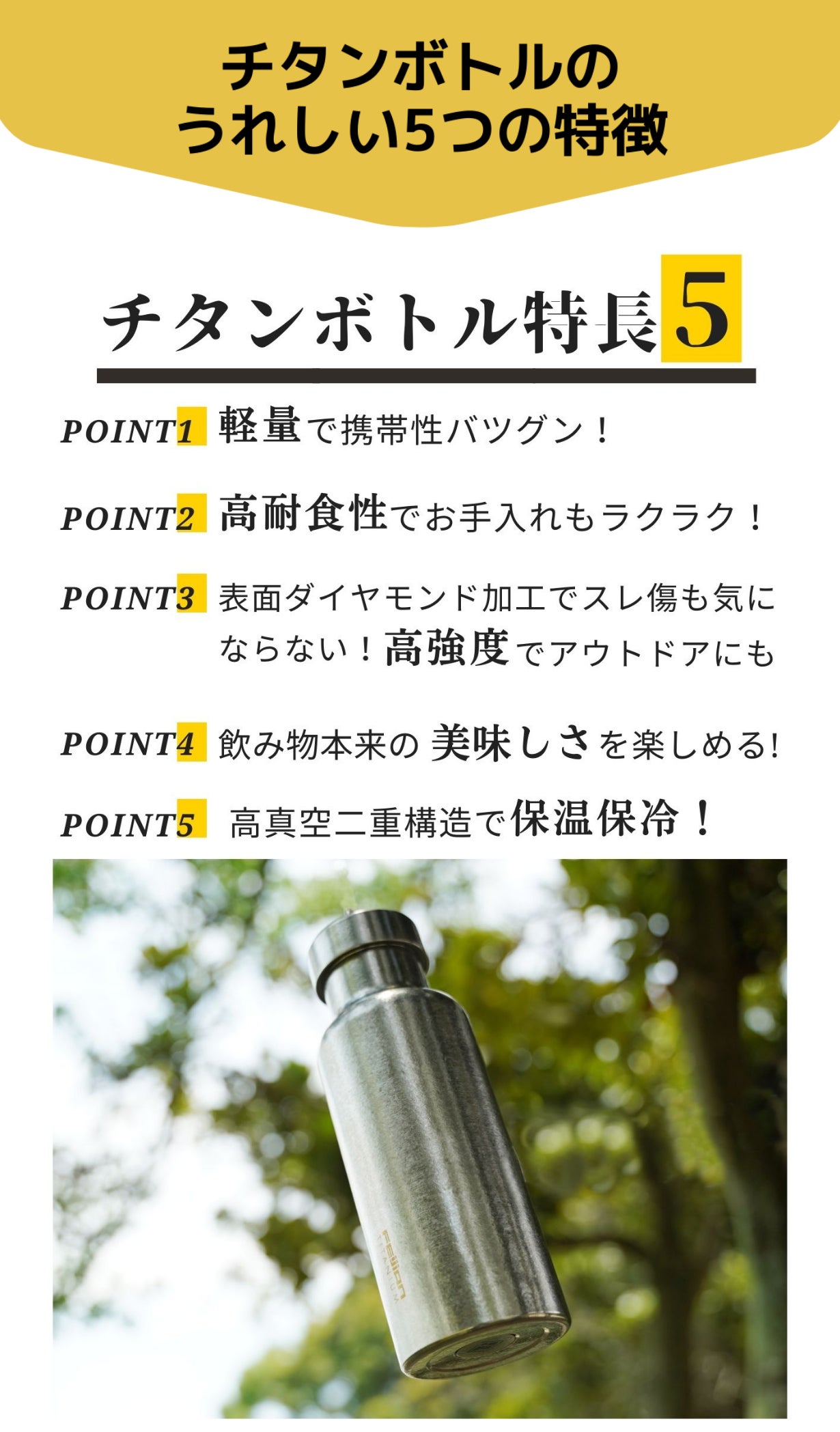 高級素材である純チタン。単に飲み物を持ち運ぶ道具ではなく、使うたびに所有する喜びを味わわせてくれる高級ボトルです。