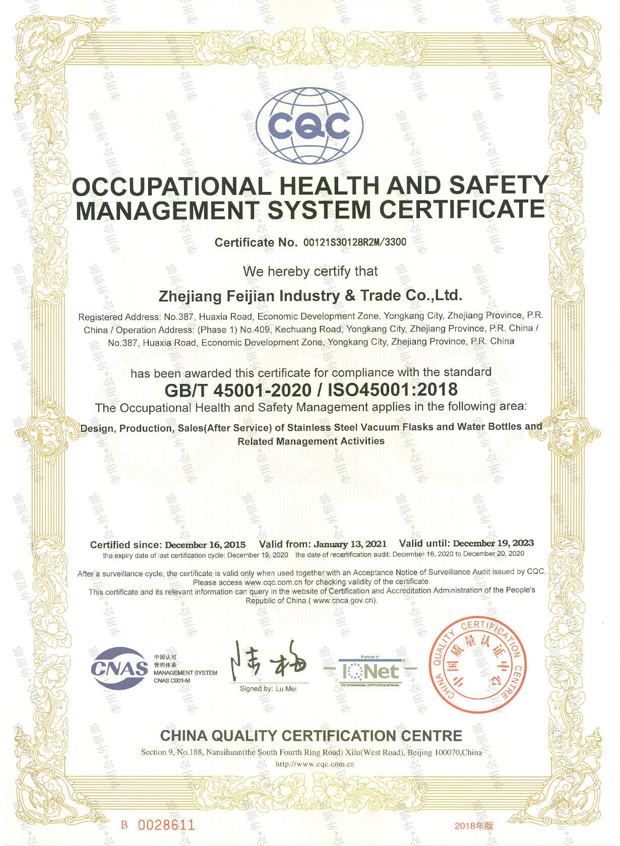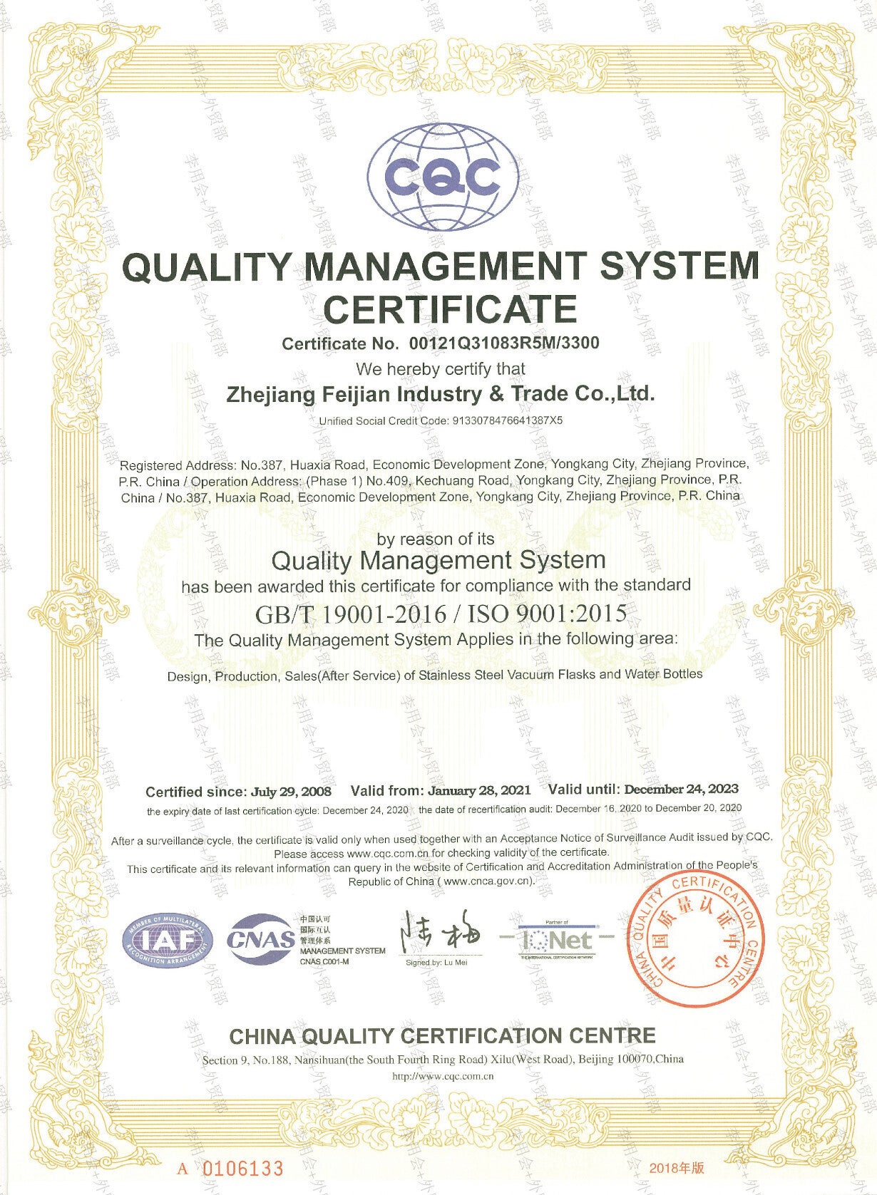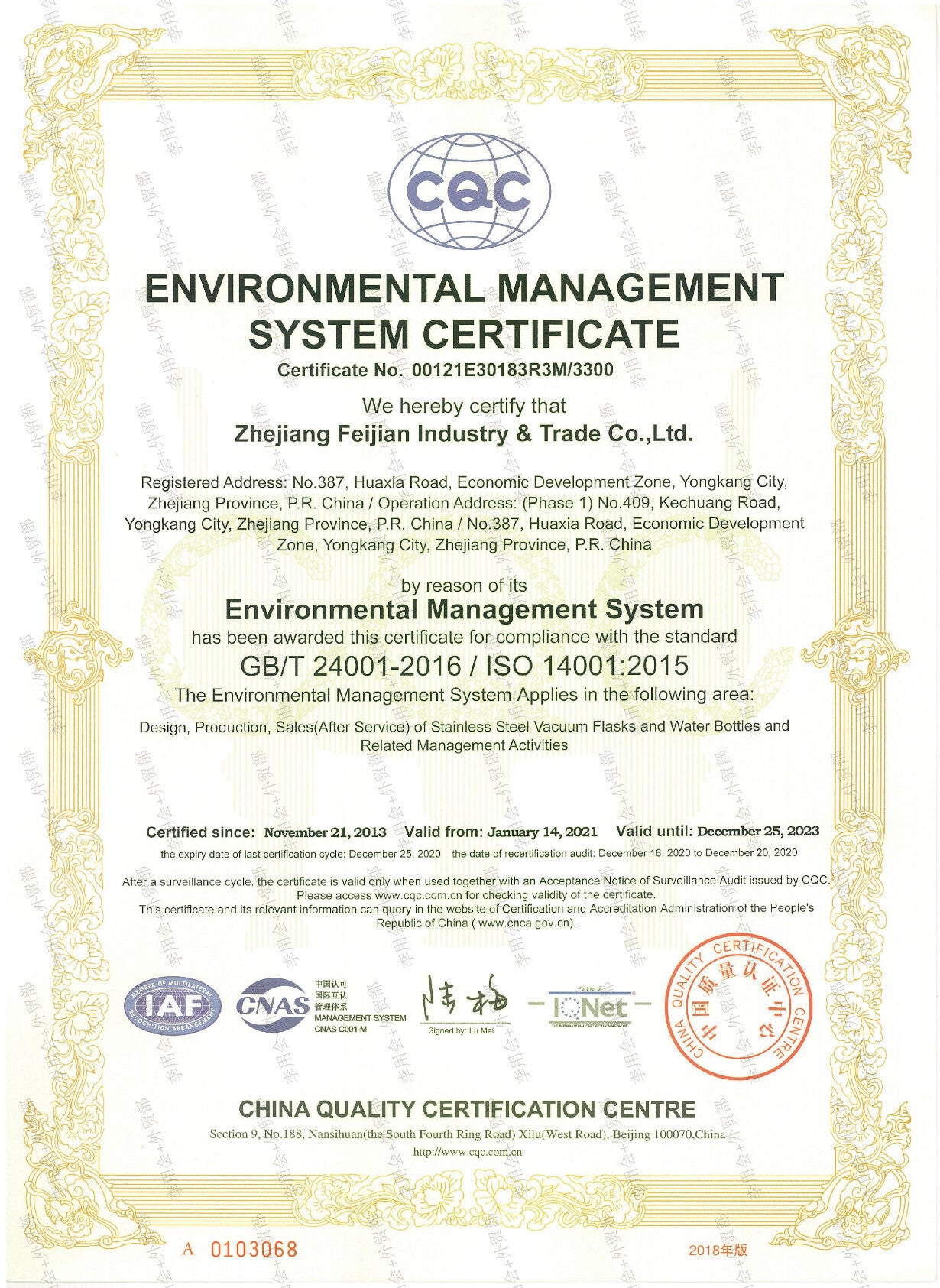 Feijian(フェイジャン)社は、国際標準化機構 (ISO) による品質マネジメントシステム(ISO 9001:2015)、環境マネジメントシステム(ISO 14001:2015)の「認証を取得」しています。