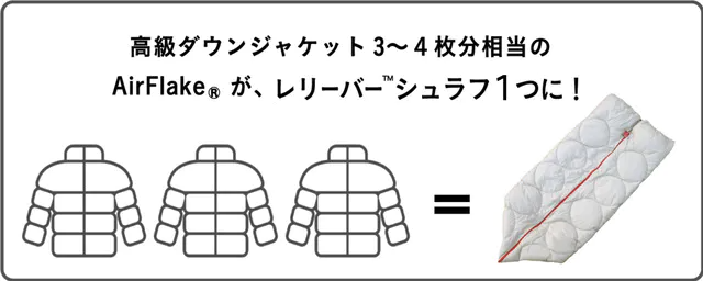 そして、レリーバー®シュラフ の中わた素材である「Air Flake®︎」は、羽毛の宝石と呼ばれる最高級羽毛「アイダーダウン」の形状や特を分析し、その特殊形状を繊維で生態模倣(バイオミメティクス)した、人工羽毛です。