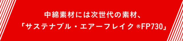 「Air Flake®︎」の良さを十分に活かす、やわらかくなめらかな肌ざわりの生地を使用。「Air=空気、Flake=ひとひら」というネーミングのとおり、ふんわりソフトな風合いの、新しい中わた素材を使用しています。繊維と繊維の間にふんわりと空気を抱え込むため、軽くて保温性に優れます。
