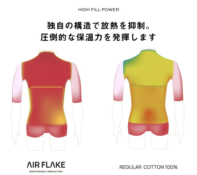 “フィルパワー”とは、かさ高性を示す指標のこと。数値が高いほどかさ高く、空気を多く含む保温力が高いと言えます。中綿AirFlakeは研究の末にたどりついた 独自の構造で、放熱を抑制し、 圧倒的な保温力を発揮します。