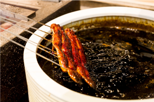 「うなぎ四代目菊川」秘伝のタレは、焼きたてのうなぎ丸ごと潜らせることで、旨みたっぷりの脂が混ざる創業より継ぎ足された秘伝のタレ。炭の香ばしさに負けない濃縮された味わいです。