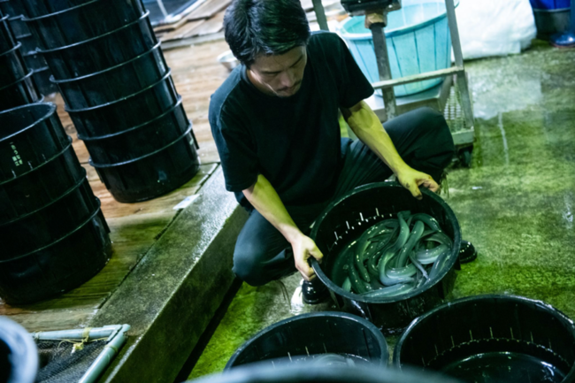うなぎ棒寿司のために選別されたうなぎを生きたまま仕入れ、その日に必要な分だけ仕入れます。