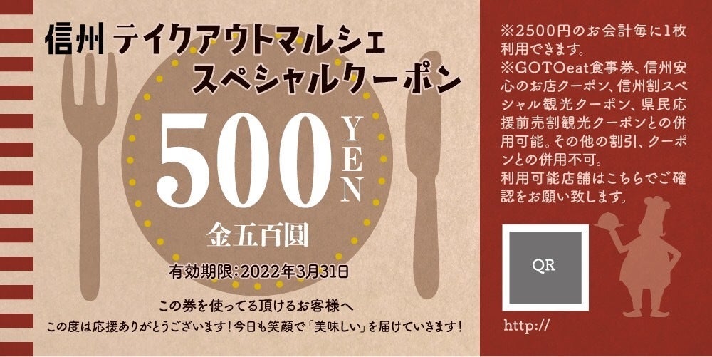 ※信州GotoEatキャンペーン食事券、信州安心のお店クーポン、信州割スペシャル観光クーポン、県民応援前売割観光クーポンとの併用が可能です。その他の割引サービスとの併用は不可とさせて頂きます。