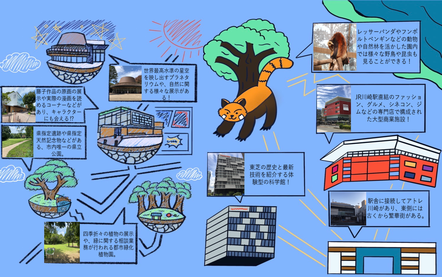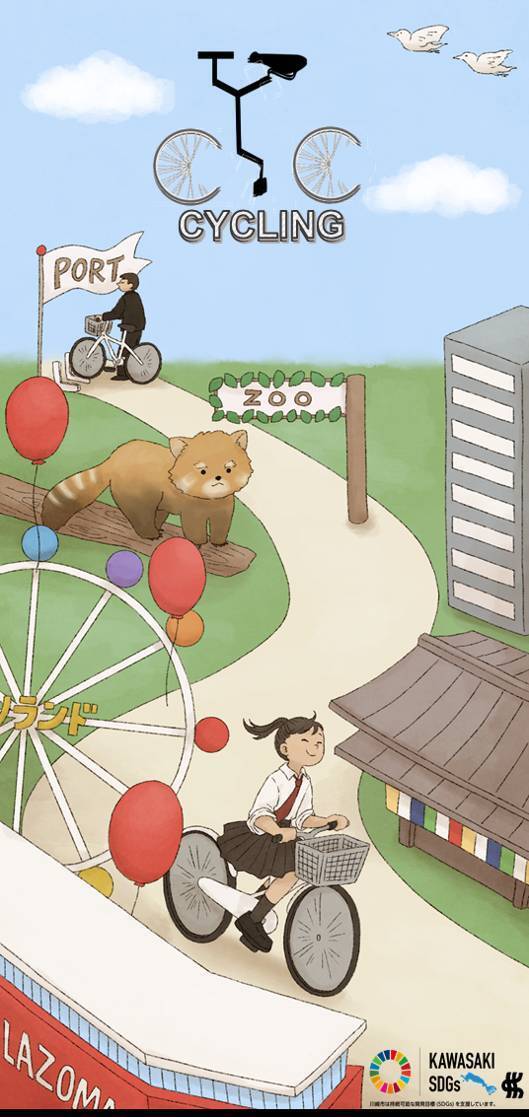 中部では川崎大師やよみうりランド、ラゾーナを描き、中央にはシェアサイクリングを涼しい顔でこぐ学生を描きました。電動なので、どなたでも利用いただけますよ♪