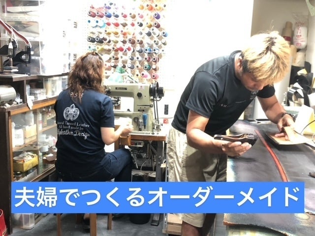 リリーレザーデザインの大城です。私たちは大阪淀川区の住宅街のど真ん中で、夫婦でオーダーメイドレザークラフトショップを営んでいます。お客様からトートバッグ、ベルト、財布、名刺入れ、スマホケースなどオーダーいただく製品は多種多様です。