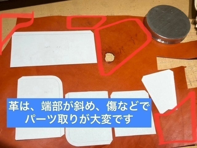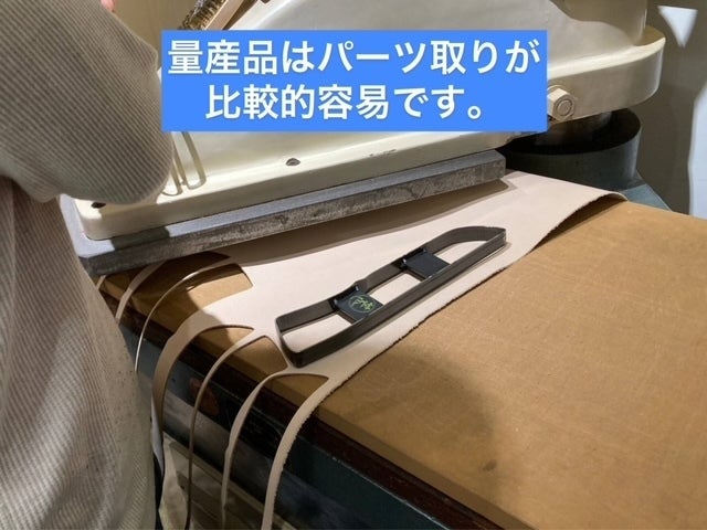 一般的な布生地は製品のパーツ取り(裁断)をする際に余すところなく仕様できます。特別なデザインなどがなければ、けこみ率(歩留まり)90%程度でしょうか。それに対して、革は布生地と違い、傷やしわ、部位による収縮率の違い、端部が並行でないなど、布生地に比べてけこみ率は60~70%くらいのことも多く、「余り革」が発生してしまいます。
