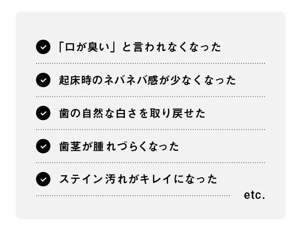ともなって、細菌から排出されるメタンガスが減少。細菌の温床となりがちな舌苔も溶解することで、口臭が少なくなっていきます。