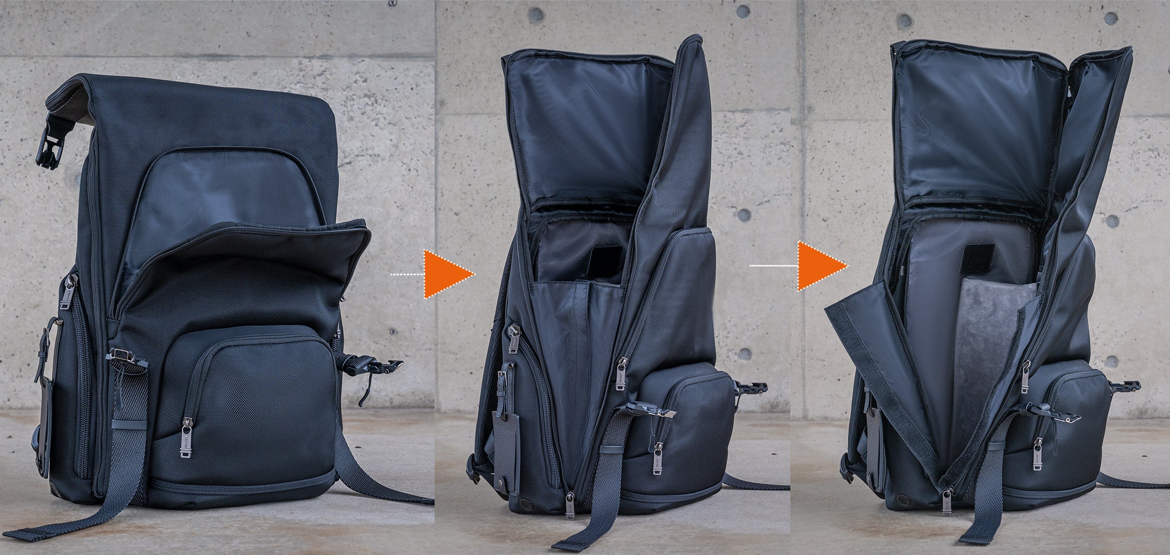 こうしたバックパックの課題に対して、「持ち運ぶ荷物の量と種類の多さによって収納サイズが変えられ、どこからでも取り出しやすいと同時に、撥水・高機能・耐久性に優れ、多くの場面に適応できるバックパックは作れないか?」という疑問から私達のバックパックの製作は開始されました。