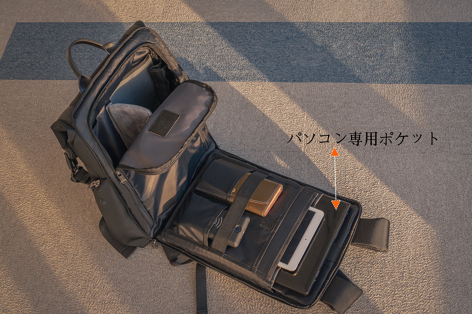 PC収納ポケットは自分の好きな角度で開けられるように作っている為、空港での手荷物検査の際は、電子機器などを取り出さなくても、セキュリティチェックにすばやく対応することができます。