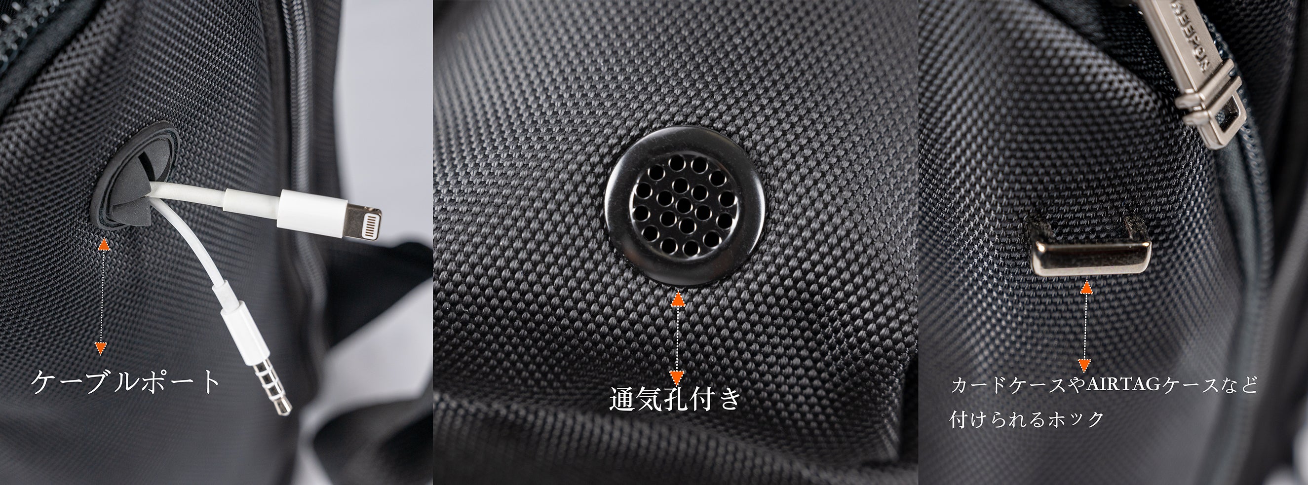 もう一方のポケットには、イヤホンや充電コードが通せるケーブルポートがあり、移動しながら充電や音楽を聴くことができます。