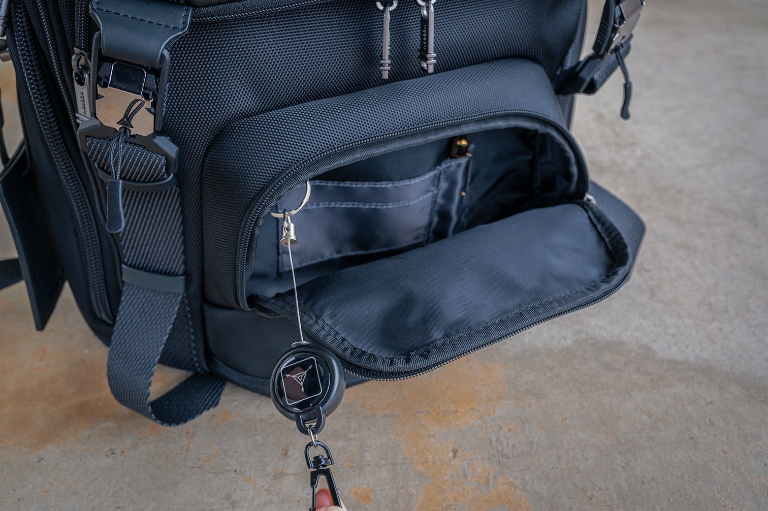 正面下部のポケットには、伸縮可能なキーホルダー、名刺やカード、筆記用具などが収納でき、小物を収納するのにとても便利な機能になっています。