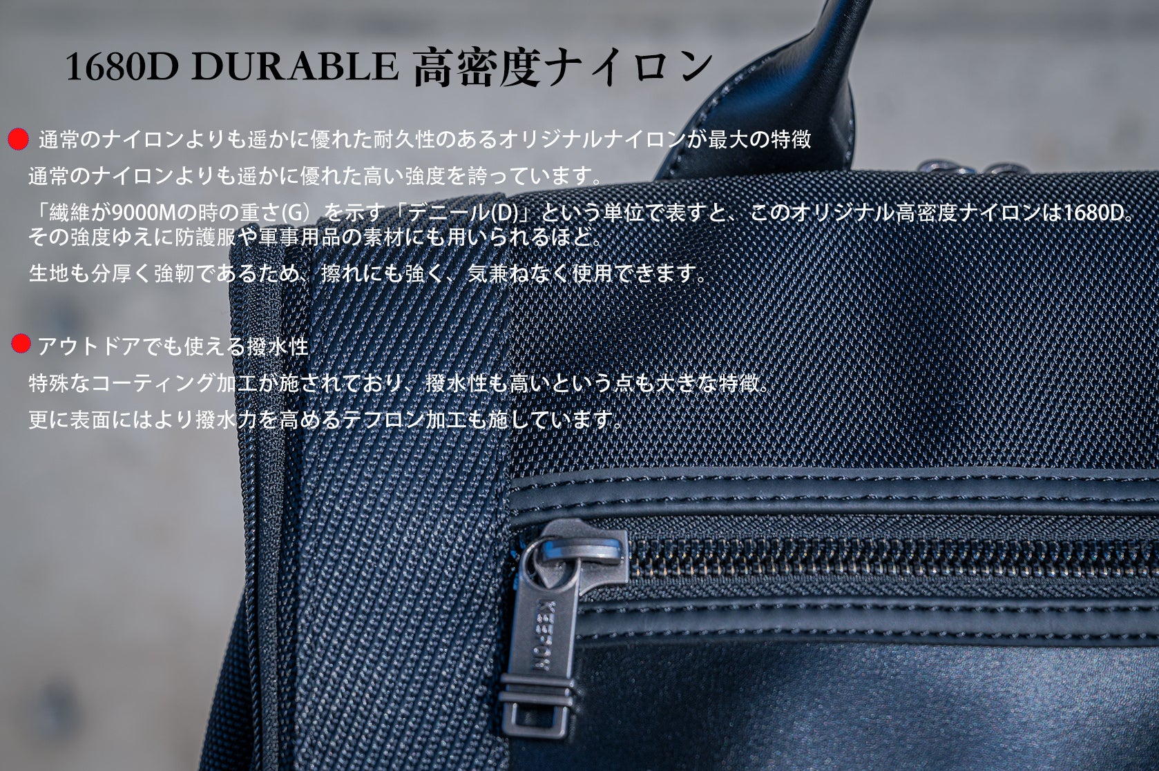 日本は雨や湿度が高い天気が多いため、バックパックの外側の生地に高密度1680Dナイロンを採用しており、優れた撥水があります。