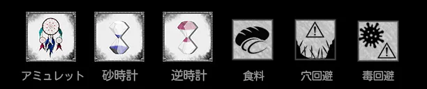 毒沼罠回避道具:ダンジョン探索中に遭遇することのある毒沼を回避することができる道具です。毒沼にはまると、徐々にダメージを受けて最悪の場合全滅の恐れもあります。