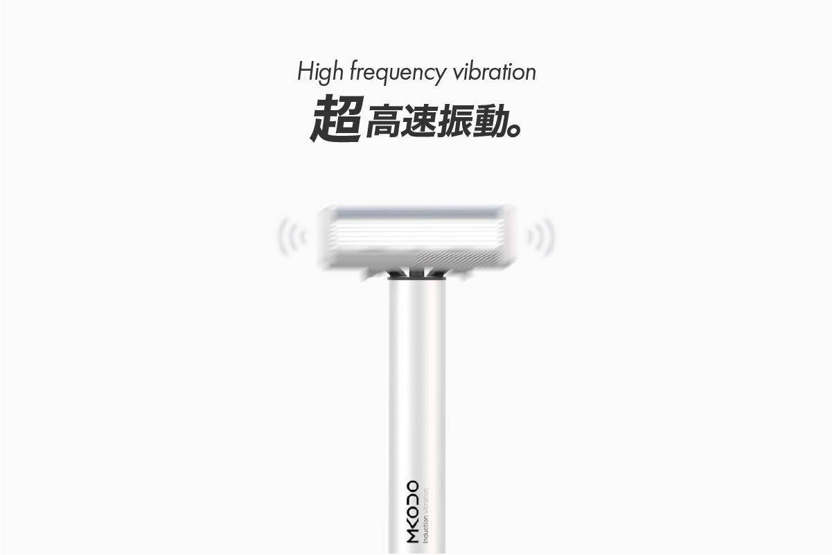 vibration shaver T1は刃に高速振動を与え、力を入れなくてもよりスムーズにシェービングします。更に高速振動により、少ないストロークでシェービングが出来、肌に当たる摩擦を減らし、肌を傷つけるリスクを軽減します。