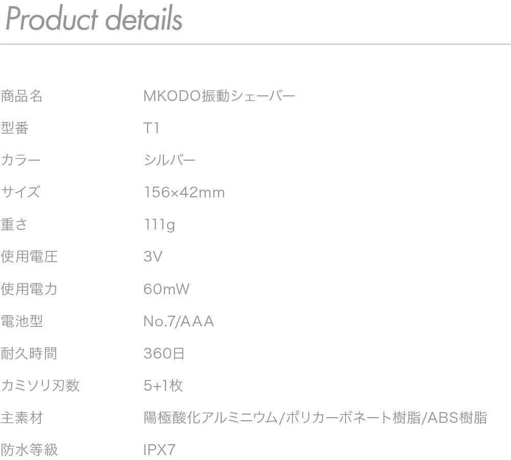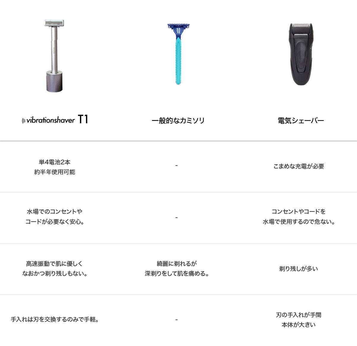 ・1日数回の使用でも1ヶ月以上使用できる商品もありますが このvibration shaver T1充電の心配はなく、電池の取り替えで持続的に使用することが可能です。