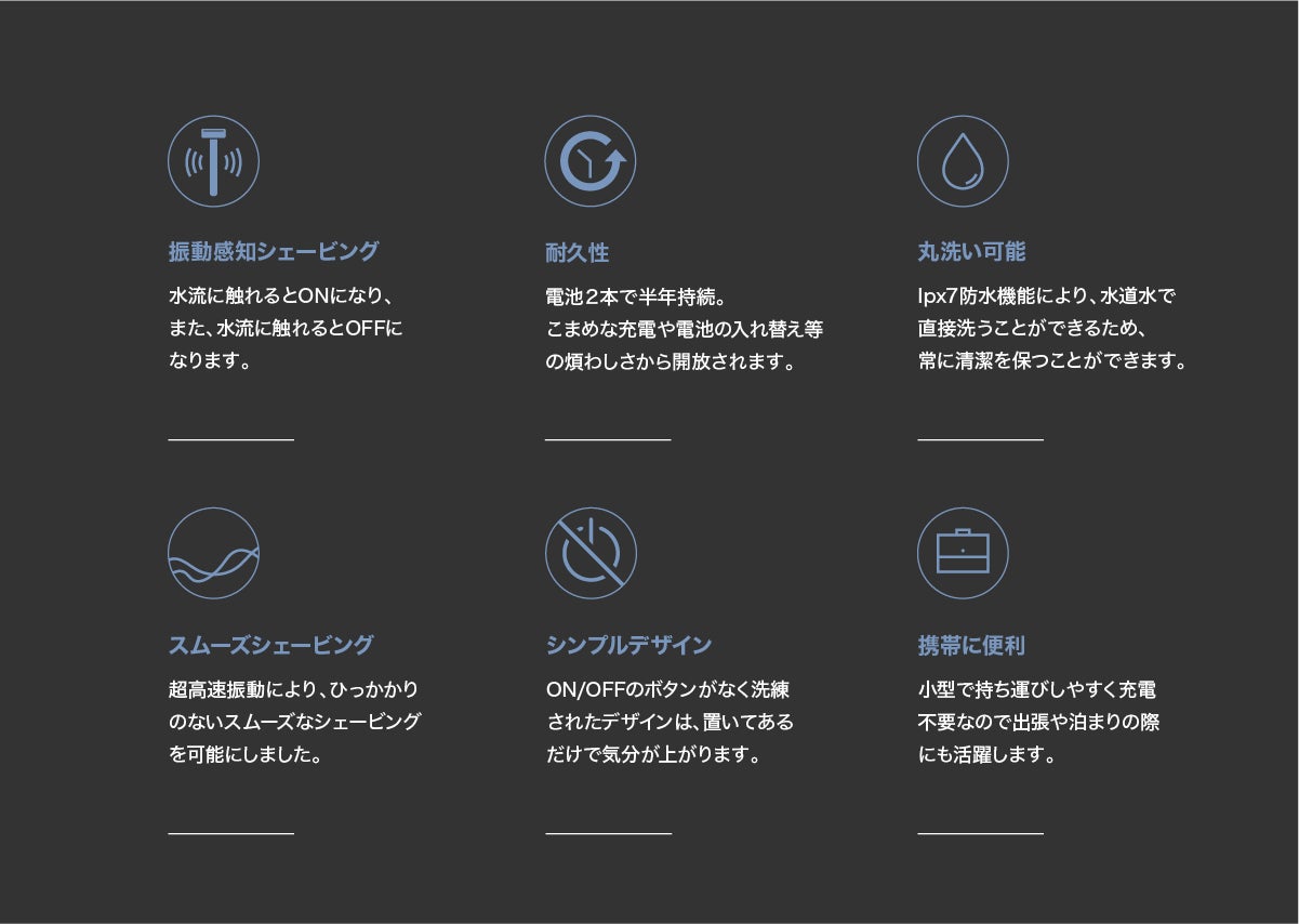 一般のT字カミソリは刃と刃の間に毛が挟まりやすいですが、vibration shaver T1は水流を感知して振動するタイプである為、振動させながら刃と刃の隙間に挟まったシェービングフォーム、ヒゲや皮膚のカスなどを浮き出させ、手間なく簡単にお手入れが出来ます。