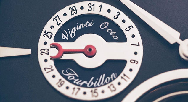 トゥールビヨン要素のある部分はくさび状に傾斜を付けたバーインデックスを配置。