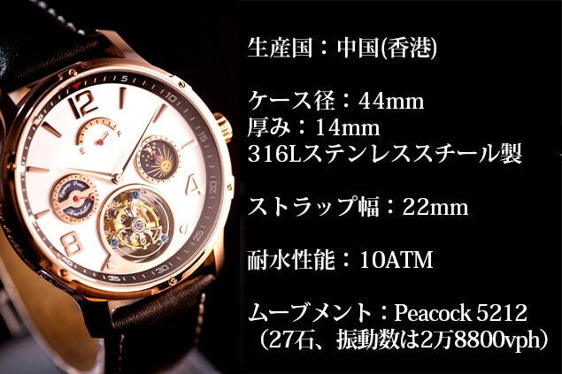 中国メーカーのなかでもPeacock社のものはローター、ベアリング、ゼンマイ部などが上手く作られ信頼性が高いとされ、VOトゥールビヨンではそのPeacock社の自動巻きムーブメント「Peacock 5216」を使用しています。