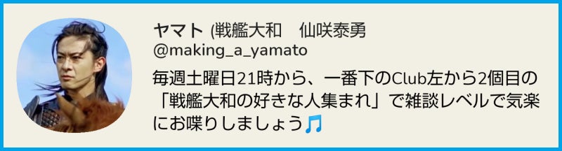 本日も、土曜日の定例会【戦艦大和が好きな人達のお部屋】を開催いたします。「僕たちの大和」原作者の仙咲泰勇が、チャットアプリClubhouse(クラブハウス)で参加者の皆様と直接お話しさせていただきます。お時間の許す限り、どうぞお楽しみください!