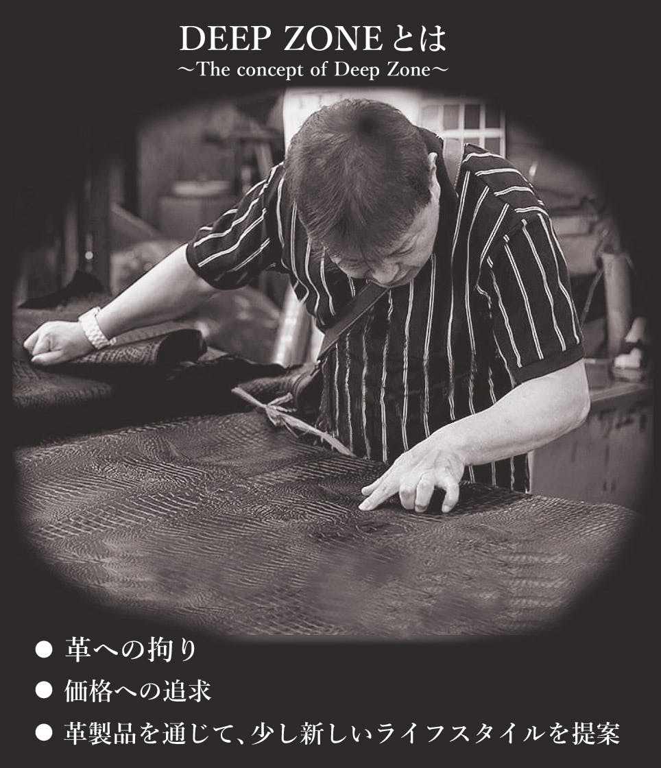 DEEP ZONEは、こだわりの本革バッグや財布、腕時計、ベルトなど多くのファッションアイテムを企画、制作し販売しております。また、上質な製品をお届けできるようにデザインから素材の選定、製造、販売に至るまで全て一貫して行っております。本物を知る全ての人々に向けて『カッコよさ』と『使いやすさ』を追求し、ハイクオリティかつハイセンスなレザーアイテムを常に提案し続けています。