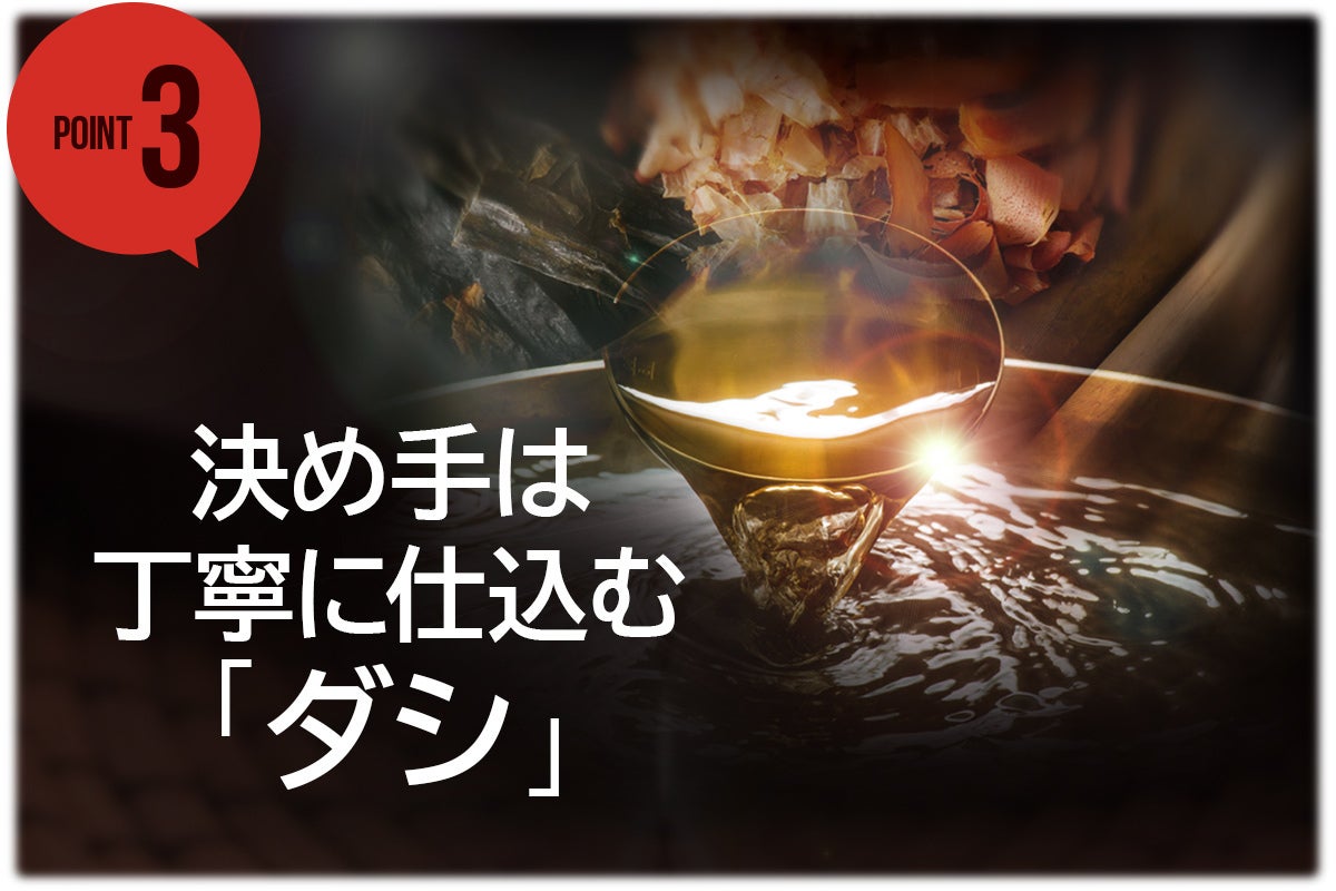 味の決め手は「出汁」に尽きます。丁寧に取った出汁は鼻から抜ける香りと共に舌にいつまでも旨みを残します。