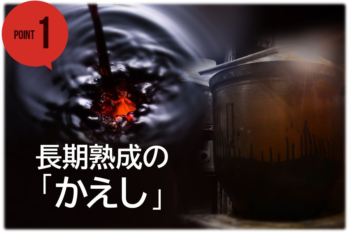 つゆの素「かえし」は厳選した醤油に砂糖、みりんを加えて火を入れ、甕で長期熟成させて完成します。