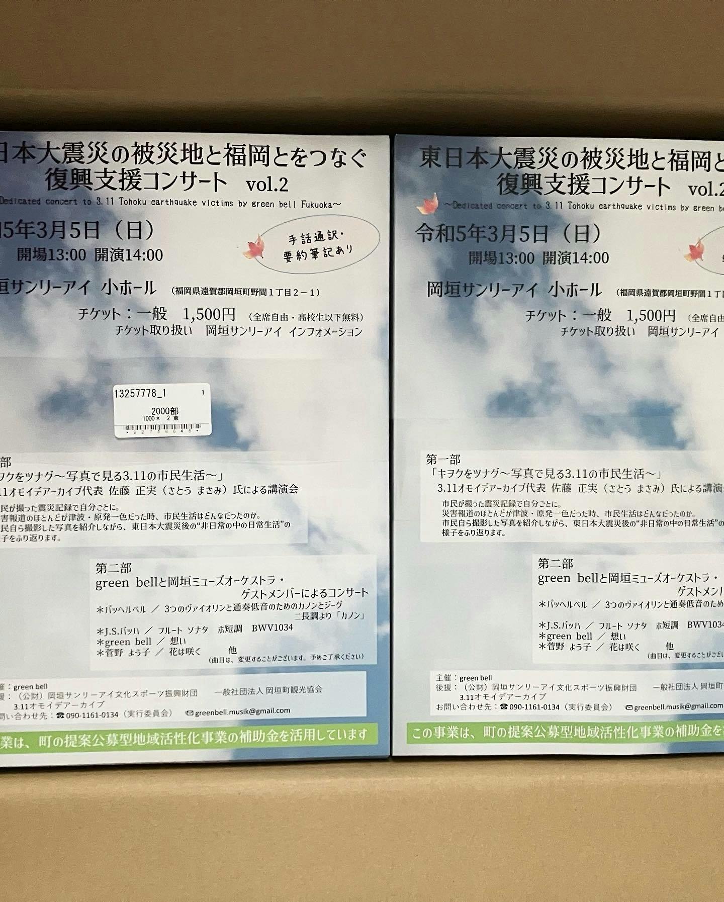 2023/01/17 11:40『東日本大震災の被災地と福岡とをつなぐ復興支援コンサート』プロジェクト、動き出しました!ご無沙汰しております!今年3月5日(日)に岡垣町・岡垣サンリーアイにて開催致しますコンサートのチラシが届きました!これから様々なところに置かせていただこうと思っています!見かけましたら、是非お手に取っていただき、手帳にチェックをお願い致します♪今回の事業は、岡垣町の提案公募型地域活性化事業の補助金を活用して行います。微力ですが、町のお役に立てる働きが出来たらと思っています。少しずつ薄れゆく記憶を、私たちの未来に活かすために繋ぎとめ、「もしも」の時に、大切な人を守ることができるようにするための『防災コンサート』です。小さな歩みですが、私たちに今できることを、継続して行っていきたいと思っています。クラウドファンディングを用いての活動は、今回は行いませんが、昨年応援してくださった皆さまに、是非お知らせしたく、活動報告を更新させていただいております。コンサートのご興味のある方、チケット購入ご希望の方がおられましたら、greenbell.musik@gmail.comまでご連絡ください。よろしくお願い致します。 もっと見る
