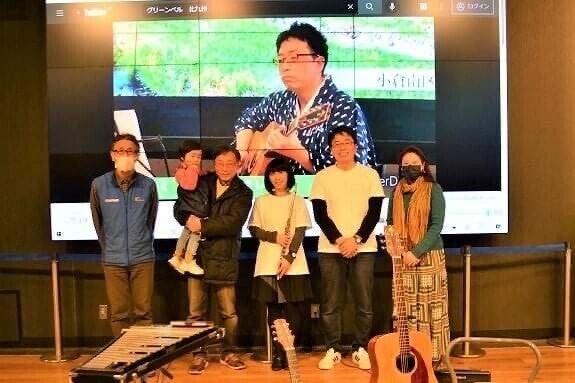 ↓いつも暖かく応援くださっている皆さんと! バックスクリーンの映像は今年3月に久留米絣を着て演奏した時のもので、「花は咲く」を演奏していました。