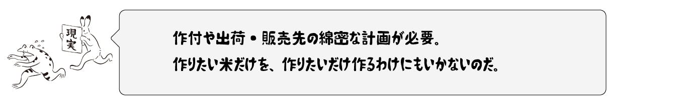 ◆出荷ルートや出荷量を見誤ると、多くのロスが生じてしまう。確実に収益をあげるために、補助金受給の目的を含む飼料米や加工米の栽培などが必要となる。出口が決まっていない状態で、自分たちが食べてもらいたいお米の田んぼの面積をただ増やすことは、大きなリスクがある。