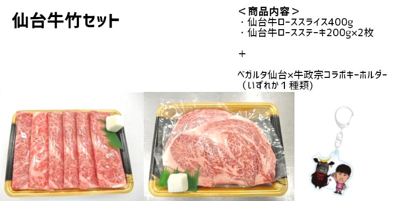 生産農家支援のため、ベガルタ仙台とコラボしたリターン品をご用意しました。宮城県出身の佐々木匠選手、吉野恭平選手、小畑裕馬選手、丑年生まれの関口訓充選手、氣田亮真選手、ストイシッチ選手の計6選手と仙台牛PRキャラクターである「牛政宗」のコラボキーホルダーなど、クラウドファンディングでしか手に入らない限定商品もございます。ぜひご支援のほどよろしくお願い申し上げます。
