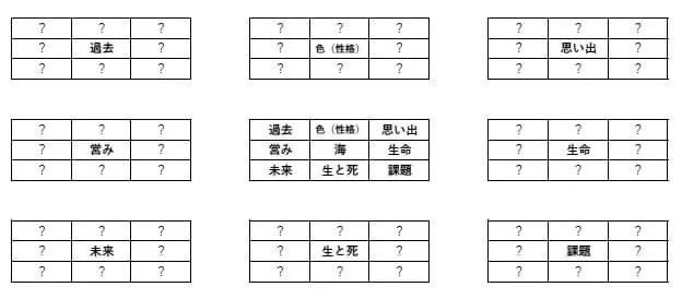 ご覧いただいているのは、実施に使用したチャートです。?になっている部分は、写真展公開前ですので伏せていますが、実際は64のセルは全て埋まっていて、各セルの要素に関連する写真を撮っています。一方で、知人に誘われて行ってみたり、帰り道で海に立ち寄ってみる、気まぐれで不確実な撮影要素も大切にしています。