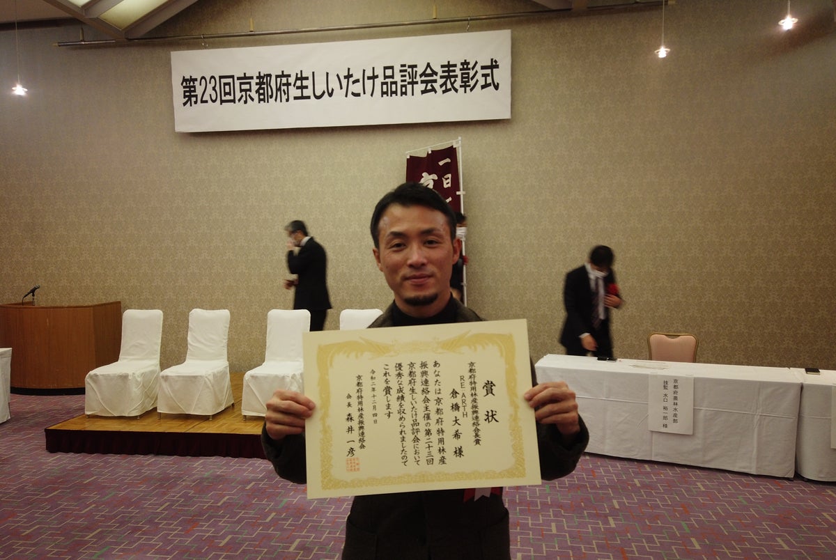 就農するまでの2年のしいたけ栽培経験と、小規模からスタートしたため1つ1つの菌床を丁寧に管理できたため、京都府生しいたけ品評会において、京都府特用林産振興連絡会長賞を受賞しました!