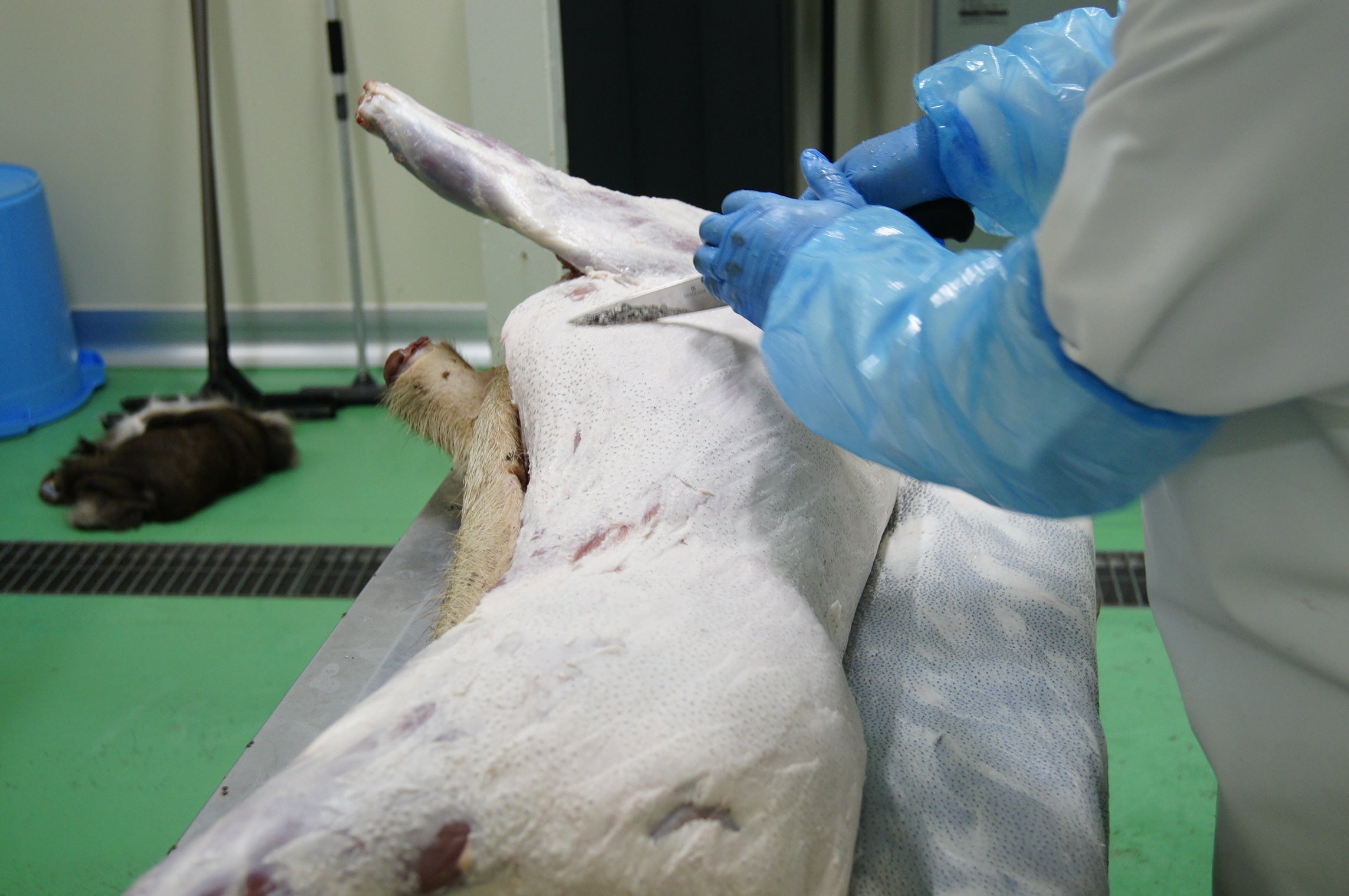 丁寧に革を剥いでいきます。この皮は兵庫県で鞣されて猪革(猪突猛進レザー)になります